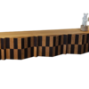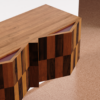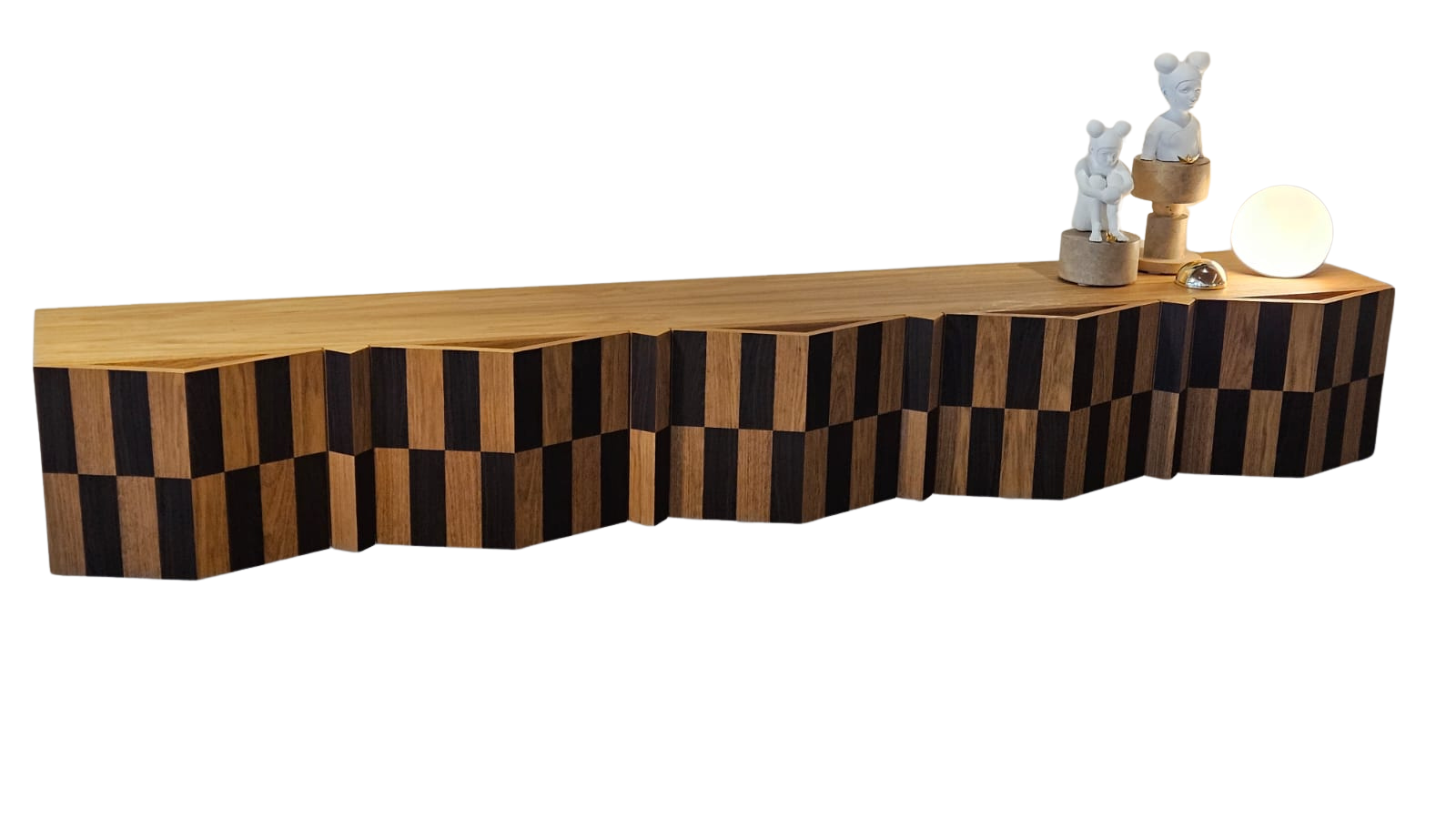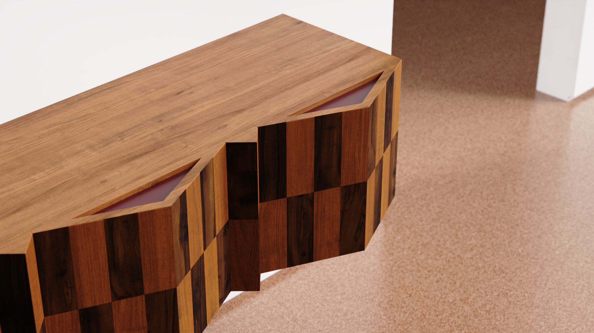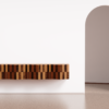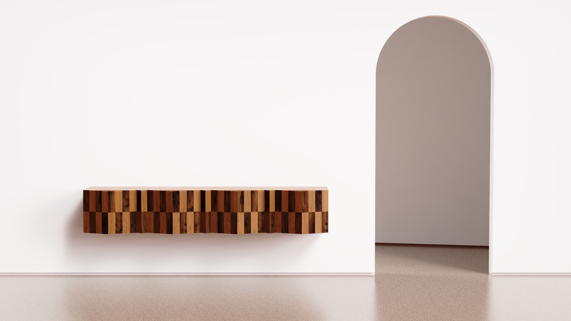 O Aparador Suspenso Nexo propõe um encontro completamente fluido entre suas facetas. A superfície é feita por um movimento contínuo que articula os ângulos e ritmos, revelando conexões sutis entre forma e função. A marchetaria em módulos alternados cria um efeito delicado e preciso.