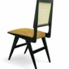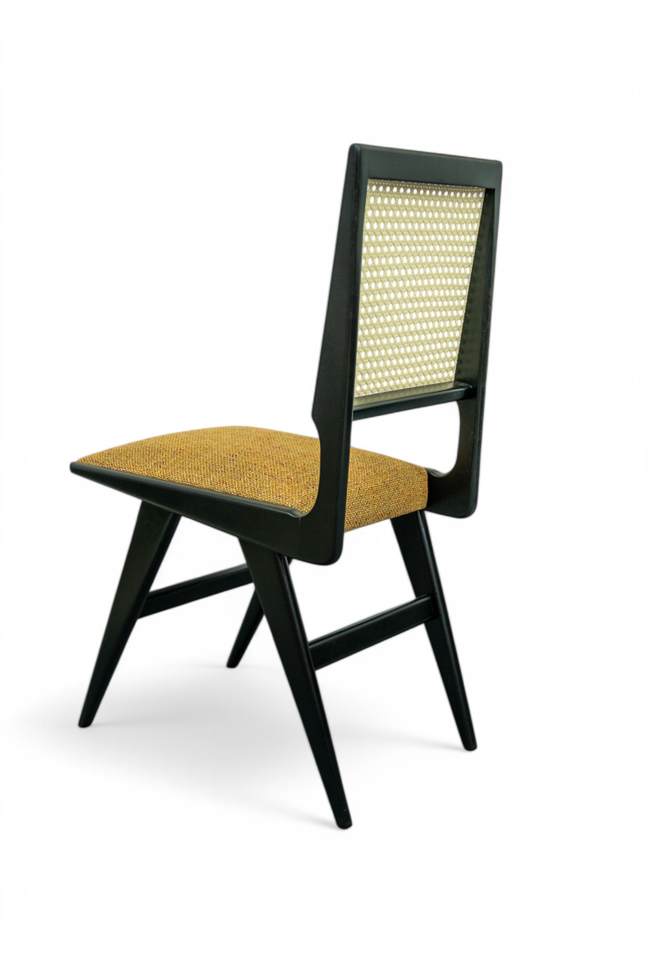 Estruturada em madeira com encaixes precisos, apresenta pés em V, característico nas criações de Carlo Hauner e Martin Eisler. O encosto em palhinha resgata a tradição artesanal com sofisticação, enquanto o assento estofado proporciona conforto no uso.