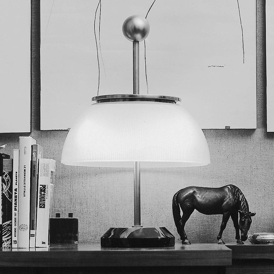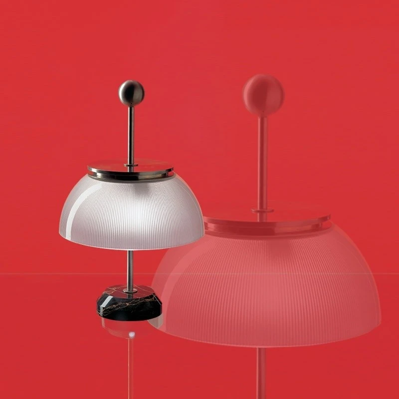 A Alfa foi a primeira luminária a figurar no catálogo da Artemide, logo no ano de fundação da empresa. Estrutura metálica em níquel opaco; difusor em cristal; base em mármore. As peças metálicas são torneadas à mão.