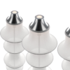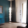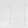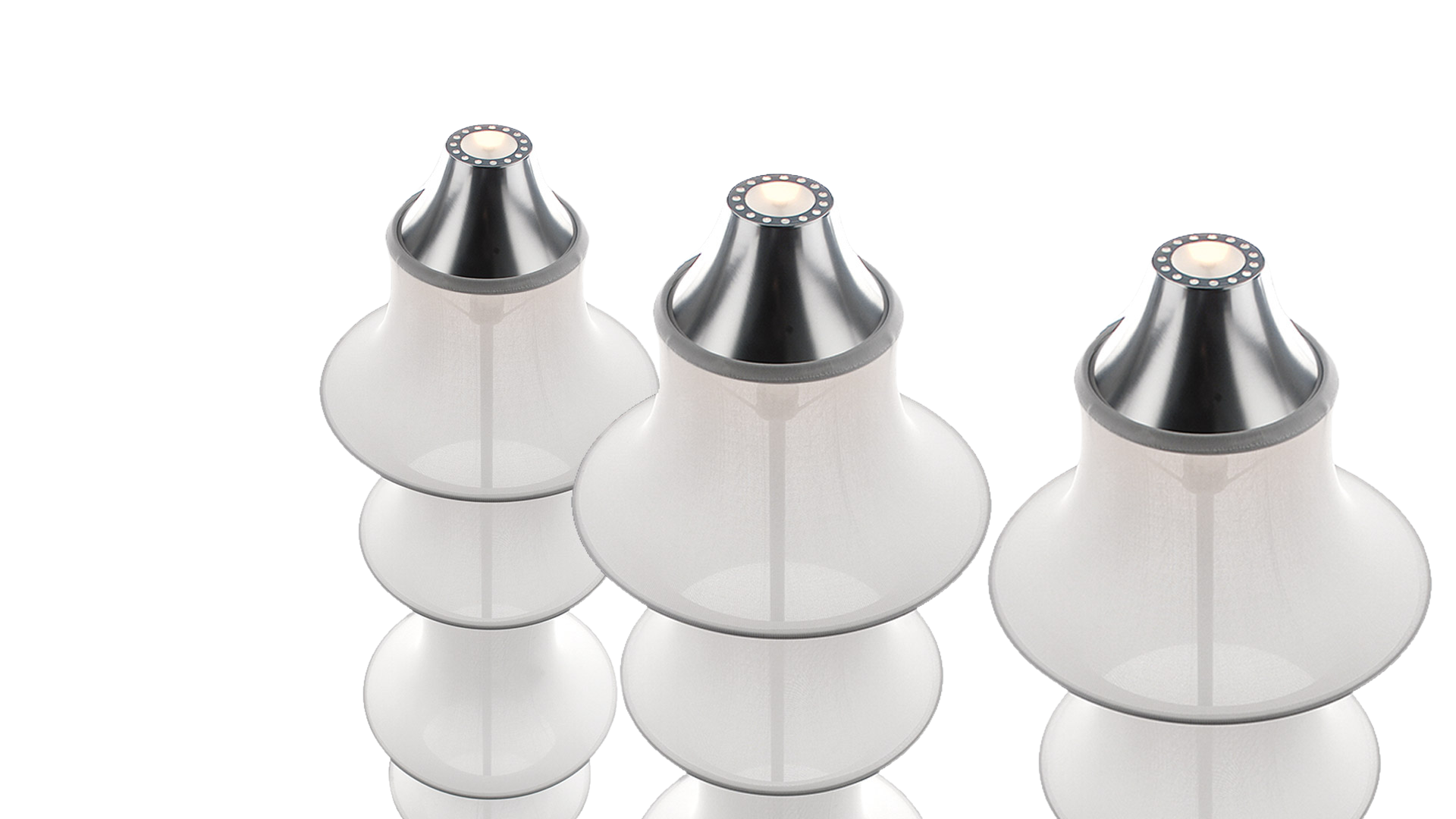 A luminária de chão Falkland possui uma forma espontânea, obtida pelo contraste entre as forças de seus componentes: a tensão de um tubo esticado de tecido finamente trançado e o peso de sete anéis de metal de tamanhos diferentes. Uma única lâmpada e um refletor de alumínio iluminam as curvas do tecido.